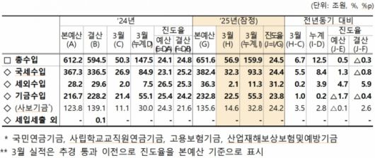 기획재정부가 15일 발표한 '월간 재정동향 5월호'에 따르면 3월 말 누계 기준 총수입은 159조9000억원으로 전년 동기 대비 12조5000억원 증가했다.