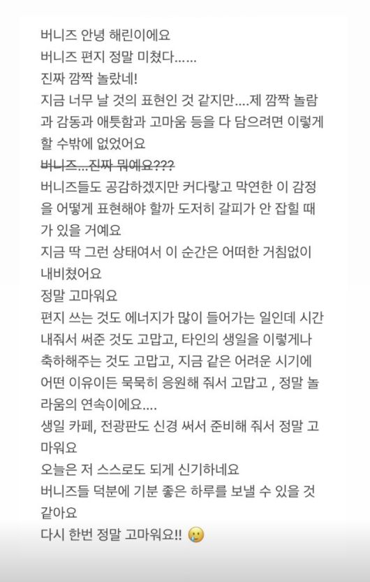 다소 격한 표현을 활용해 감동을 표했다. "버니즈 안녕. 편지 정말 미쳤다"며 "진짜 깜짝 놀랐다. 버니즈 진짜 뭐냐"고 되물었다.