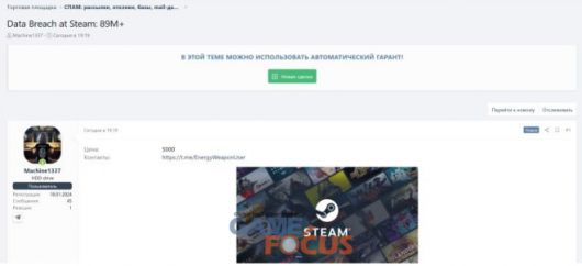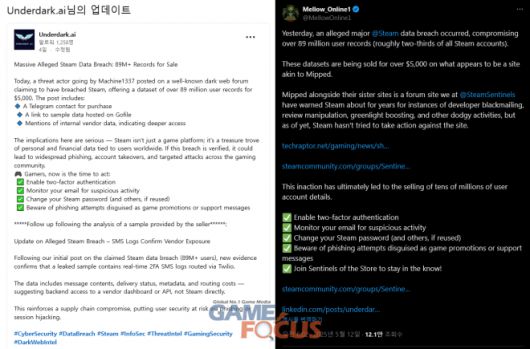 Underdark.AI라는 이용자는 한 게시글을 통해 다크 웹에서 8900만 개의 '스팀' 계정 정보를 5000달러에 판매하고 있다는 글을 발견했다고 주장했다. 또 X(前 트위터)의 '@MellowOnline1'이라는 이용자는 이 게시글을 인용하며, 최근 '스팀'의 계정 8900만 개가 해킹돼 다크 웹에서 5천 달러에 거래되고 있지만 밸브가 이에 대해 아무런 조치도 취하지 않고 있다고 주장했다.