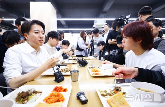 [서울=뉴시스] 황준선 기자 = 이준석 개혁신당 대통령선거 후보가 15일 서울 서초구 서울교육대학교를 찾아 학생들과 식사하며 대화를 하고 있다. 2025.05.15. hwang@newsis.com