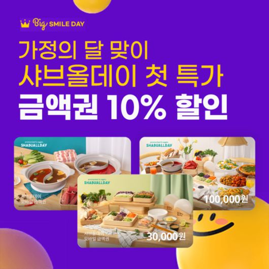 (문화뉴스 박선혜 기자) 호텔식 샤브뷔페 브랜드 샤브올데이가 G마켓과 옥션에서 진행한 '빅스마일데이(5월 7일~13일)'에 참여해 모바일 금액권 전 품목을 10% 할인 판매하며 높은 고객 호응을 이끌어냈다고 밝혔다.