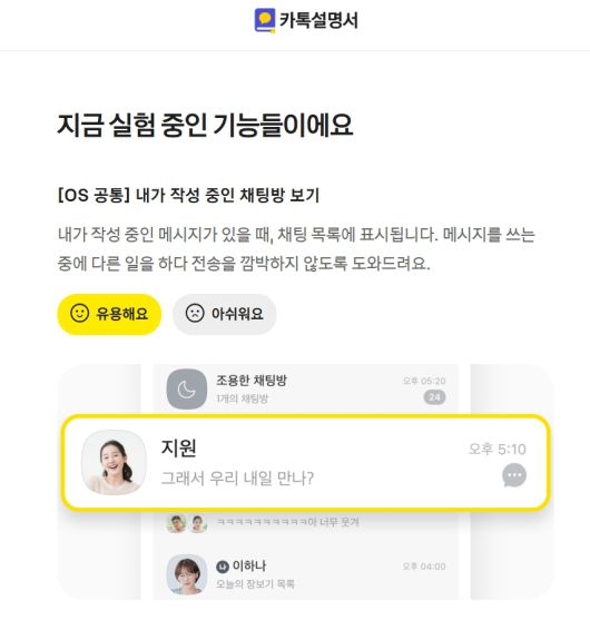 카카오 측은 “이용자 간 원활한 소통과 대화의 흐름 유지를 위한 기능”이라며 “온라인 환경에서도 오프라인에서처럼 자연스러운 대화 경험을 구현하고자 실험실을 통해 해당 기능을 시험 적용하게 됐다”고 밝혔다. 카톡 설명서에는 “메시지를 쓰는 중에 다른 일을 하다 전송을 깜박하지 않도록 도와준다”고 설명했다.