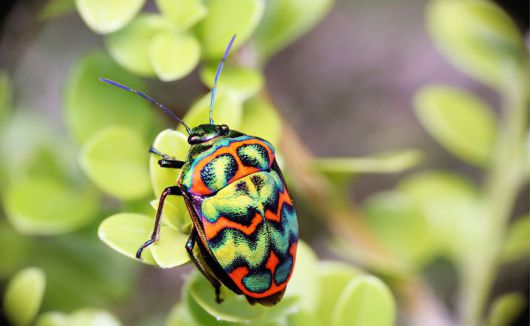 큰광대노린재는 노린재목 광대노린재과에 속하며, 금녹색 광택과 붉은 줄무늬가 특징이다. 자신을 방어하기 위해 사과와 계피가 섞인 듯한 향을 내며, 회양목을 기주식물로 삼고 실내에서도 화분을 통해 사육이 가능하다.