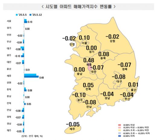 15일 한국부동산원이 발표한 5월 둘째주(12일 기준) 전국 주간아파트 동향에 따르면 세종 아파트 매매가격은 0.48%오르며 전주(0.40%)보다 상승폭을 확대했다. 세종 집값은 지난달 14일 0.04% 오르며 상승전환 한 뒤 상승폭 확대와 축소를 반복하며 6주 연속 오름세를 이어가고 있다. (4월7일 -0.07%→4월14일 0.04%→4월21일 0.23%→4월28일 0.49%→5월5일 0.40%→5월12일 0.48%) 도담동, 고운동, 다정동 등 선호단지 중소형 규모 위주로 가격이 상승하고 있다.