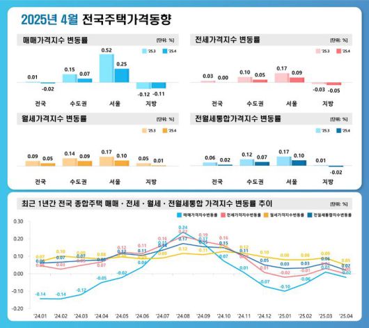 15일 한국부동산원의 '2025년 4월 전국주택가격동향조사' 결과에 따르면 전국의 매매가격 지수가 0.02% 하락했으며 수도권은 0.07% 상승한 것으로 나타났다. 전국 주택 매매가격(0.01%→-0.02%)은 상승에서 하락으로 전환됐다. 수도권(0.15%→0.07%)과 서울(0.52%→0.25%)은 상승폭이 축소됐다.