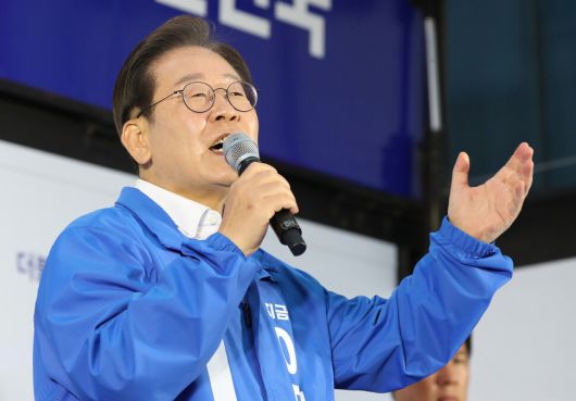 이재명 더불어민주당 대통령 후보가 14일 경남 거제시 엠파크차없는거리에서 열린 집중유세에 참석, 지지를 호소하며 연설하고 있다. 공동취재사진 |