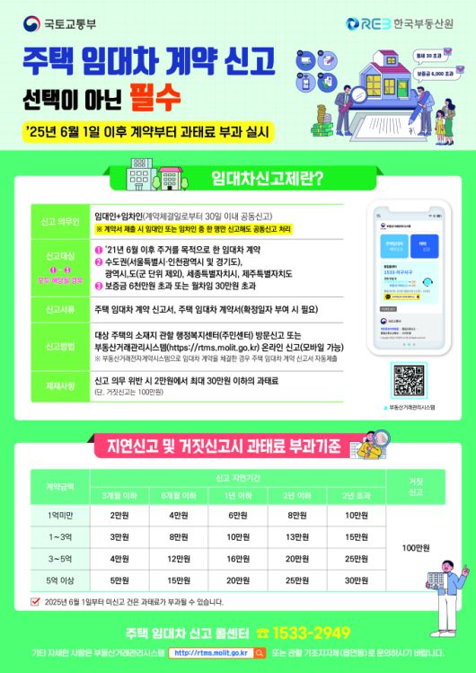 신고를 하지 않으면 2만 원에서 최대 30만 원의 과태료가 부과되며 허위 신고 시에는 최대 100만 원까지 과태료가 부과된다. 계도기간 중 체결된 계약은 과태료 부과 대상에서 제외되며 6월 1일 이후 체결된 계약부터 적용된다.