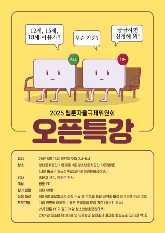1부에서는 홍난지 청강대 만화콘텐츠스쿨 교수가 웹툰의 연령등급 기준을 다양한 사례 중심으로 설명하며, 2부에서는 김지경 한국청소년정책연구원 박사가 청소년 보호정책의 기본 원칙과 웹툰 업계의 실천 방안을 제시할 예정이다.