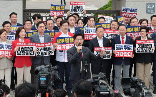 김 후보는 이날 오후 서울 서초구 대법원 앞에서 국민의힘 의원들과 함께 ‘사법부 수호 및 민주당 규탄대회’를 열고 이렇게 말했다. 현장에는 권성동 원내대표, 김용태 비상대책위원장 등이 참석했다.