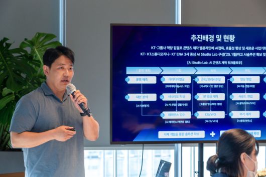 KT는 올 1월 KT스튜디오지니와 KT ENA 3사 중심의 ‘AI 스튜디오 랩’을 구성했다. 콘텐츠 제작 벨류체인에 AI를 접목해 효율성을 높이고 새로운 사업기회를 모색하기 위한 조직으로, KT 미디어그룹사의 역량을 총집결시켰다.