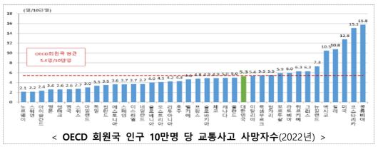 2024년 도로 교통사고 사망자 수는 2521명으로 12년 연속 감소했다. 그러나 인구 10만 명당 사망자 수는 5.3명으로 여전히 경제협력개발기구(OECD) 회원국 중 중하위권 수준(25위/38개국, 2022년 기준)에 그친다. 정부는 애초 지난해 사망자 수를 2100명대로 줄이는 것을 목표로 했으나 달성에는 실패했다.