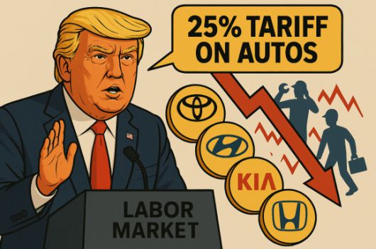 도널드 트럼프 미국 대통령이 미국으로 수입되는 자동차에 25% 관세를 부과한다고 밝히자 현대자동차와 기아, 도요타와 혼다 등 한일 자동차 기업의 주가가 폭락한 것을 표현한챗 GPT 이미지. 서울신문DB