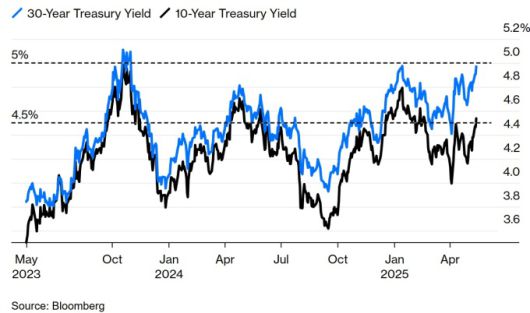 이와 별도로 CNBC에 따르면 정책 금리에 가장 민감한 2년 만기 국채 수익률이 4.039%에 거래, 4월 말 3.62%에서 가파르게 뛰었고 30년물 수익률 역시 4월 초 4.33%에서 최근 4.963%까지 올랐다.