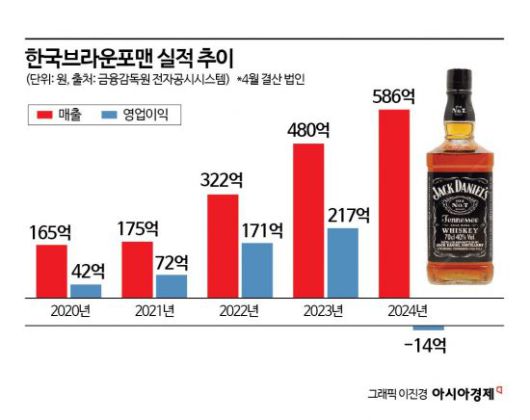 한국브라운포맨도 올해 수익성 개선이라는 과제를 해결해야 한다. 4월 결산법인인 한국브라운포맨은 지난해(2023년 5월~2024년 4월) 적자로 전환하며 14억원의 영업손실을 기록했다. 매출액은 전년 대비 20% 이상 증가한 586억원으로 높은 성장세를 유지했지만 관세청으로부터 '세금과공과' 명목으로 258억원의 과징금을 부과받으며 수익성이 크게 훼손됐다.
