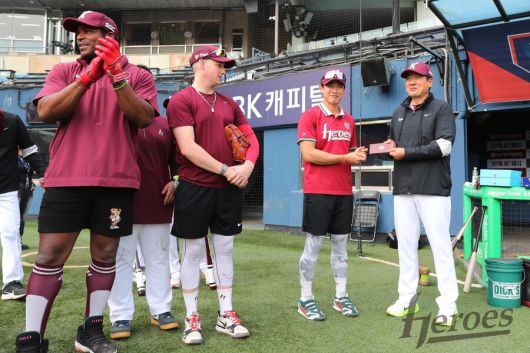 키움 선수단은 5연패 중에서도 작은 이벤트로 분위기를 띄우려 노력했다. 15일 스승의 날을 맞아 선수단이 코칭스태프에게 상품권을 전달했다. 주장 송성문이 선수단 대표로, 홍원기 감독이 코칭스태프 대표로 나왔다.