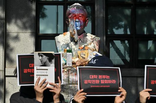 동덕여대 학생들이 지난해 11월 12일 서울 성북구 학교 캠퍼스에서 남녀공학 전환 논의를 규탄하는 기자회견을 하고 있다. 조용각 전 이사장 흉상이 계란, 밀가루 등 오물로 뒤덮여 있다. 정다빈 기자 |