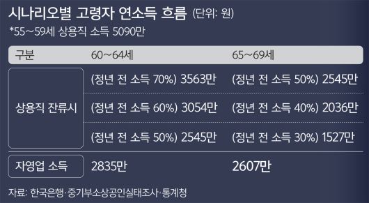 그 방안으로는 먼저 고령층이 기존 상용직 일자리에서 계속 근로할 수 있도록 ‘임금체계 개편을 동반한 퇴직 후 재고용 제도’ 강화를 제안했다. 한은이 시나리오별로 분석한 결과 60∼64세에 정년 전 소득의 60%, 65∼69세에 40%를 받으면 은퇴 후 자영업 소득과 비슷해지는 것으로 나타났다. 자영업 선택 시 전환비용과 초기 창업비용 부담이 크고 향후 소득 변동성도 높은 만큼 상용직에서 계속근로가 보장된다면 급여가 줄더라도 기존 일자리를 선택할 가능성이 높다는 것이다.
