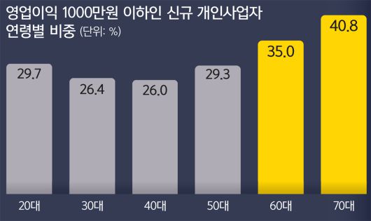 2014년 이후 10년간 늘어난 고령 자영업자(농림어업 제외) 47만명 가운데 운수창고·숙박음식·도소매·건설업에서만 29만명이 불었다. 지난해 고령 자영업자의 취약업종 종사 비중은 65.7%로 15~59세(56.2%)보다 훨씬 높았다. 또 창업한 지 3년 이내 고령 자영업자의 35%는 연간 영업이익이 1000만원에도 못 미치는 것으로 나타났다.