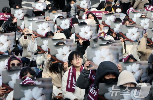 동덕여대 재학생들과 참석자들이 3일 오후 서울 안국역 인근에서 재단 규탄 집회를 열고 학교 측의 학생 대상 고소 철회를 촉구하며 목화꽃이 그려진 손팻말을 들고 있다. 목화꽃은 동덕여대의 교화다. 2025.3.3/뉴스1 ⓒ News1 이동해 기자