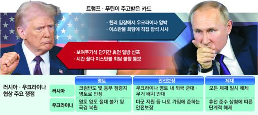 도널드 트럼프 미국 대통령도 해당 회담 참석을 운운하면서 열기를 띄웠지만, 푸틴 대통령은 여기에 놀아나지 않았다. 미국을 비롯한 서방의 지원 없이 전쟁 수행이 불가능한 우크라이나를 상대로 전황에서 우위를 보이는 러시아는 국제사회 압박에 동요할 필요가 없기 때문이다. 미국·러시아 정상이 우크라이나 미래를 건 ‘카드 게임’에서 푸틴 대통령이 트럼프 대통령의 기세를 꺾은 셈이다.