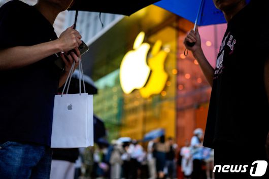 중국 상하이의 한 애플 스토어 앞에서 한 남성이 새 아이폰이 든 쇼핑백을 들고 서 있다. 2023.09.22/ ⓒ 로이터=뉴스1 ⓒ News1 권진영 기자 |