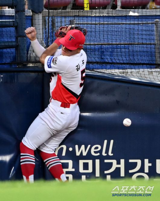 15일 광주KIA챔피언스필드에서 열린 롯데와 KIA의 경기, 3회초 KIA 3루수 김도영이 롯데 레이예스의 파울 플라이를 잡으려다 펜스와 충돌하고 있다. 광주=허상욱 기자wook@sportschosun.com/2025.05.15/