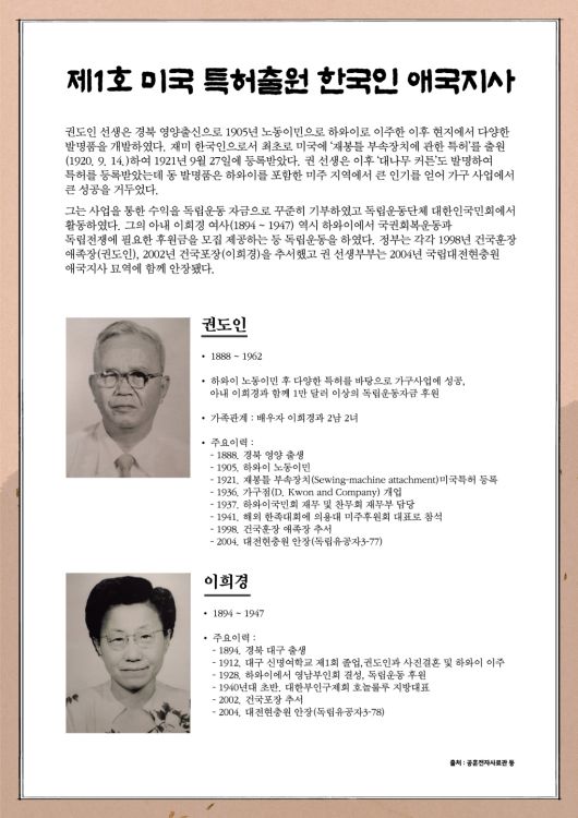 제1호 미국 특허출원 한국인인 권도인 애국지사 부부 소개 자료. 특허청 제공 |