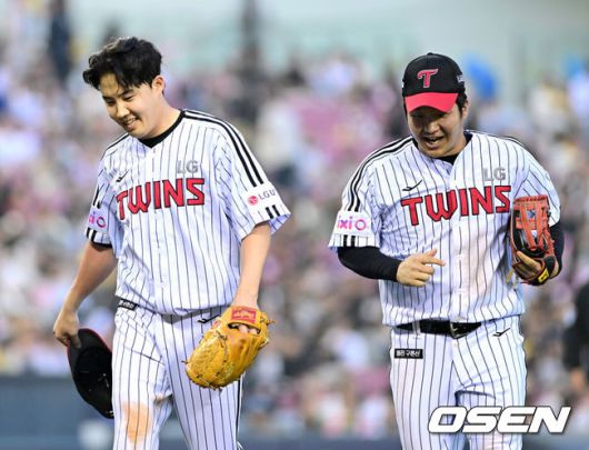 [OSEN=잠실, 최규한 기자] 15일 서울 잠실야구장에서 ‘2025 신한 SOL Bank KBO리그’ LG 트윈스와 키움 히어로즈의 경기가 열렸다.이날 홈팀 LG는 임찬규, 방문팀 키움은 하영민을 선발투수로 내세웠다.4회초 2사 1루 상황 키움 푸이그의 땅볼 타구를 처리한 LG 3루수 문보경과 선발 임찬규가 인사를 나누고 있다. 2025.05.15 / dreamer@osen.co.kr |