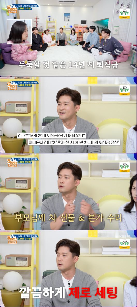 14년 치 퇴직금에 대해 김대호는 “중간에 다 정산을 했다”라고 말했다. 14년동안 번 돈에 대해 김대호는 “부모님께 차 선물 하고 본가 집 짓는데 보태드렸다. 다 썼다”라고 말해 눈길을 끌었다.
