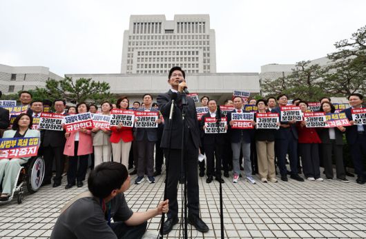 김문수 국민의힘 대통령 후보가 15일 서울 서초구 대법원 앞에서 열린 사법부 수호 및 더불어민주당 규탄대회에서 발언하고 있다. 연합뉴스 |