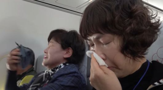 경북 문경 화재 현장에서 순직한 고(故) 김수광 소방장의 음성 편지가 기내에 울려 퍼지자 눈물을 흘리는 탑승객들./소방청 공식 유튜브