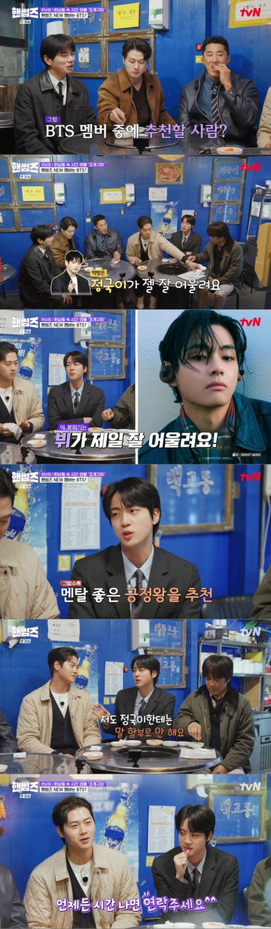 이이경은 "너네 멤버 중에 이 프로그램이랑 잘 어울릴 멤버 있냐. 생각날 친구"라며 궁금해했고, 진은 "지금 이 롤이면 정국이가 제일 잘 어울린다. 진짜 잘 먹는다. 그리고 이 분위기에는 뷔가 제일 잘 어울린다. 서로 헐뜯고 막말해도 타격을 입지 않는 친구"라며 정국과 뷔를 언급했다.