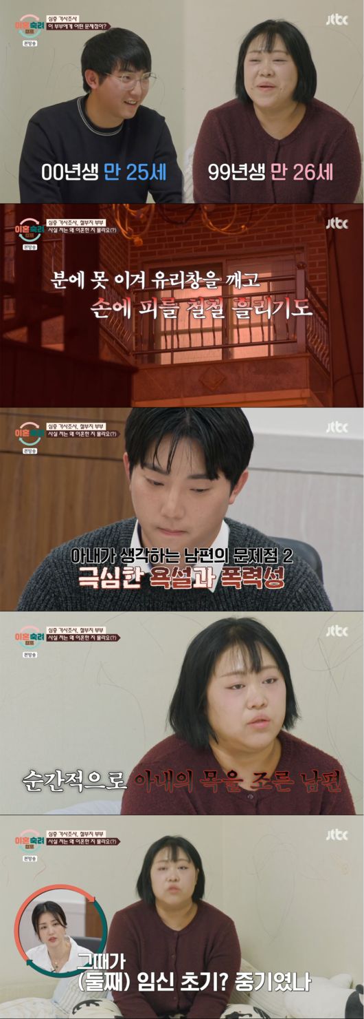 부부는 둘째가 뱃속에 있을 때 이혼을 했다고. 아내는 “(남편이) 욱하는 성격이 제일 컸고 물건을 부수거나 화를 내거나 욕하거나”라며 이혼 사유를 전했다. 남편은 임신중인 아내의 목을 조르기도 했다고 전해 모두를 놀라게 만들었다.