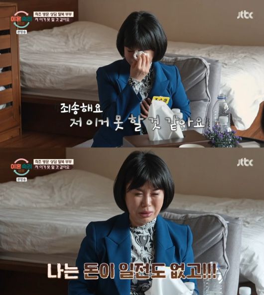 아내는 이호선 상담가를 보자 “죄송하다. 나 이거 못할 것 같다”며 눈물을 흘렸다. 이호선 상담가가 “어떤 점이 제일 속상했냐”고 묻자 아내는 “남편은 해결이 안 되는데 나는 보는 것만으로도 숨 막힌다. 나는 돈이 일전도 없고 모든 게 엉망이 됐다”고 울부짖었다.