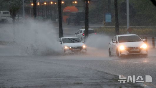 [서귀포=뉴시스] 우장호 기자 = 폭우가 쏟아진 1일 오후 제주 서귀포시 도순동 인근 도로에서 차량들이 물보라를 일으키며 이동하고 있다. 2025.05.01. woo1223@newsis.com |