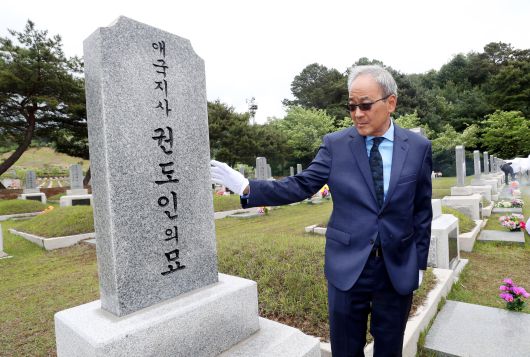 15일 대전 현충원에서 열린 애국지사 권도인 선생의 추모식에 참석한 외손자 폴 아리나가(Paul Arinaga)씨가 할아버지 비석을 쓰다듬고 있다. 이날 특허청은 ‘제1호 미국 특허출원 한국인’이라고 새긴 새로운 비문을 공개했다./신현종 기자 |