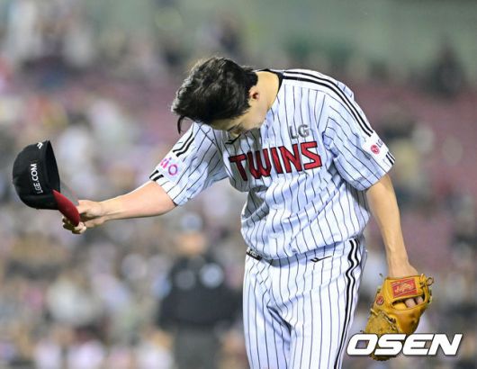 [OSEN=잠실, 최규한 기자] 15일 서울 잠실야구장에서 ‘2025 신한 SOL Bank KBO리그’ LG 트윈스와 키움 히어로즈의 경기가 열렸다.이날 홈팀 LG는 임찬규, 방문팀 키움은 하영민을 선발투수로 내세웠다.7회초 1사 주자없는 상황 LG 임찬규가 키움 카디네스에게 몸 맞는 공을 내준 뒤 모자를 벗어 사과의 뜻을 표하고 있다. 2025.05.15 / dreamer@osen.co.kr |