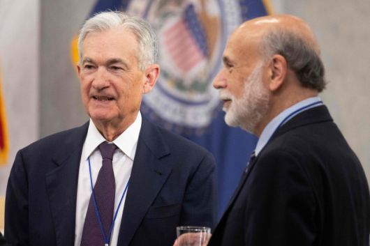 제롬 파월(왼쪽) 미국 연방준비제도(연준) 의장과 벤 버냉키(오른쪽) 전 연준 의장이 15일(현지시간) 워싱턴 DC 연준 청사에서 열린 토머스 로바크 리서치 콘퍼런스에서 말을 나누고 있다. 파월 의장은 이날 연설에서 도널드 트럼프 대통령을 직접 거론하지는 않았지만 관세가 '공급충격'을 불러 미 고금리를 예상보다 더 오래 지속하게 만들 수 있다고 경고했다. AFP 연합 |