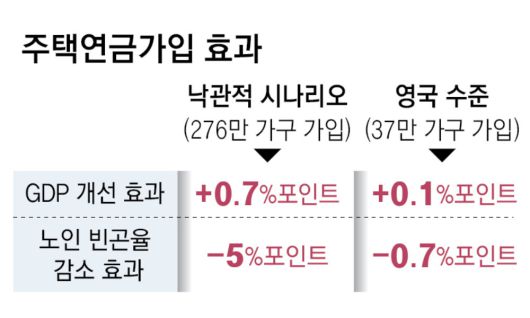 주택연금 가입자 수가 늘어나면 실질 국내총생산(GDP)을 최대 0.7%포인트 높이고 노인 빈곤율도 5%포인트까지 낮출 수 있다는 진단이 나왔다. 가입이 저조한 주택연금을 활성화하면 고령화에 따른 소비 축소, 노인 빈곤 등 한국 경제의 고질적인 문제를 다소 완화할 수 있다는 얘기다.