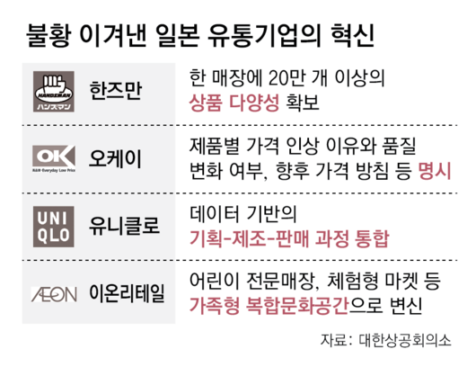 대한상공회의소는 15일 ‘불황을 이겨낸 일본 혁신 유통기업의 대응 사례와 시사점’ 연구 보고서를 통해 일본 유통기업들의 혁신 사례를 소개했다.