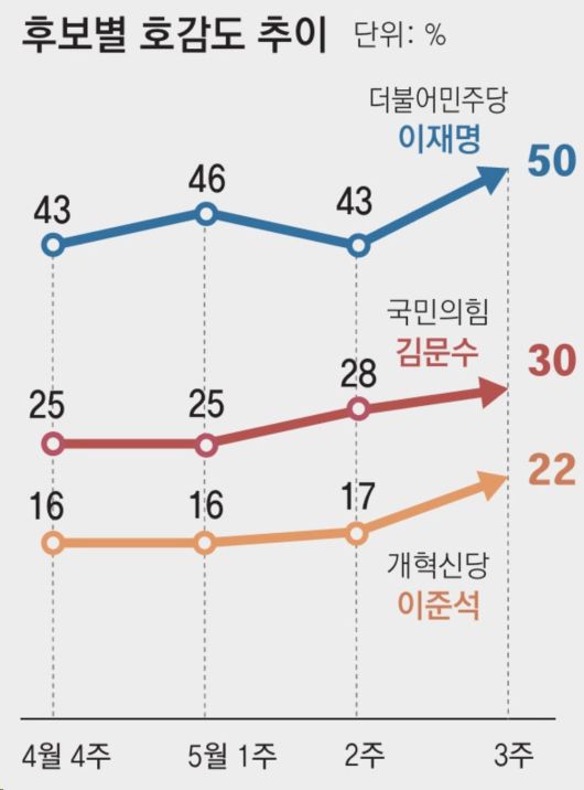 이날 발표된 조사에서 이재명 후보에게 ‘호감이 간다’고 답한 응답자는 50%로 ‘호감이 가지 않는다’는 응답(46%)을 넘어섰다. 이재명 후보의 호감도가 비호감도보다 높아진 것은 처음이다. 김 후보의 호감도는 30%, 비호감도는 65%였으며 이준석 후보는 호감도 22%, 비호감도 72%였다. 정치권 관계자는 “정치인 호감도나 정당 지지도 조사는 후보 지지도의 선행 지표”라며 “이 후보의 지지도 흐름이 견고하다는 것을 보여주는 신호”라고 했다.