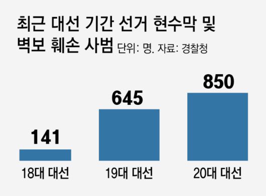 대선 후보 현수막과 벽보를 훼손하는 범죄는 점점 늘고 있다. 경찰청에 따르면 2022년 제20대 대선 당시 현수막이나 벽보를 훼손한 혐의로 붙잡힌 이들은 850명이다. 2017년 제19대 때는 645명, 2012년 제18대 때는 141명이었다.