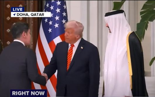 지난 14일(현지시간) 셰이크 타밈 빈 하마드 알사니 카타르 군주가 주최한 국빈만찬에 앞서 트럼프 트럼프 대통령과 악수하는 정용진 신세계그룹 회장. / 미 ABC방송 유튜브 화면 갈무리. |