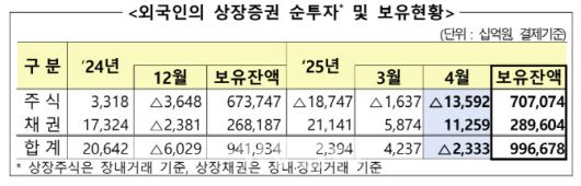 금융감독원은 16일 “4월 중 외국인은 상장주식 13조5920억원을 순매도하고, 상장채권 11조2590억원을 순투자해 총 2조3330억원을 국내 증권시장에서 순회수했다”고 밝혔다.