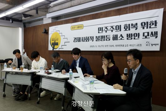 참여연대가 15일 서울 종로구 참여연대 아름드리홀에서 ‘민주주의 회복 위한 경제사회적 불평등 해소 방안 모색’ 토론회를 열고 있다. 문재원 기자 |