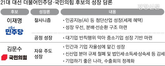 ‘선 성장, 후 분배론’을 먼저 주장하고 나선 측은 이재명 더불어민주당 후보다. 이 후보는 지난 2월 MBC <100분 토론>에서 “경제에 집중하지 않으면 마이너스 성장인데, 분배고 공정이고 얘기할 틈이 어디 있나”라며 “살아남아야 복지도 있다”고 말했다. 실제 이 후보가 중앙선거관리위원회에 제출한 10대 공약집에는 ‘불평등·양극화 완화’ 단어가 등장하지 않는다.