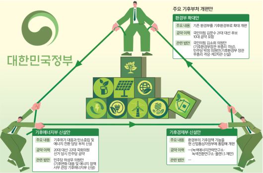진영을 가리지 않고 기후부처 개편 주장이 쏟아지는 건 그만큼 기후변화가 심화한 데다 기존 정부 거버넌스로는 제대로 된 대응이 불가능하다는 문제 인식 때문이다. 다만 양 진영이 내놓고 있는 조직 개편의 모양새를 보면 기후 문제에 대한 시각 차가 분명하다. 민주당은 기후변화에 따른 경제·산업 재편에 정부 역할이 있다고 보는 반면, 국민의힘은 그보다 기후재난에 초점을 맞춰 정부 역량을 강화할 필요가 있다는 입장이다.
