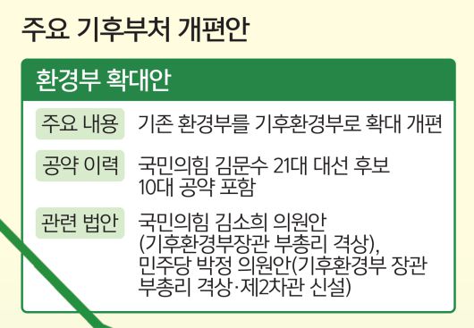 실제 이미 국민의힘뿐 아니라 민주당에서도 기후환경부 개편을 골자로 한 정부조직법 개정안을 국회에 발의한 상태다. 국민의힘 김소희 의원이 지난해 10월 발의한 법안을 보면 현재 1차관 체제인 환경부를 2차관 체제로 확대하고, 2차관이 기후변화 대응 정책의 총괄·조정 업무를 담당하도록 해놨다. 현재는 환경부 내 실장급 조직인 ‘기후탄소정책실’이 기후 정책을 관할하고 있다.