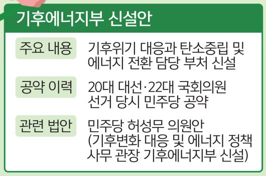 이런 문제의식에서 나온 게 기후에너지부 신설안이다. 이는 환경부 내 기후 조직과 산업부 내 에너지 조직을 각각 떼어내 새로운 부처를 만든다는 구상이다. 현재 산업부 2차관이 전력·재생에너지·원전 등 에너지 정책을 총괄하고 있다. 이미 국회에서도 민주당 허성무 의원이 올 3월 기후에너지부 신설을 골자로 한 정부조직법 개정안을 발의했다. 민주당은 2022년 20대 대선과 지난해 22대 국회의원 선거에서 이미 기후에너지부 신설을 공약했다.