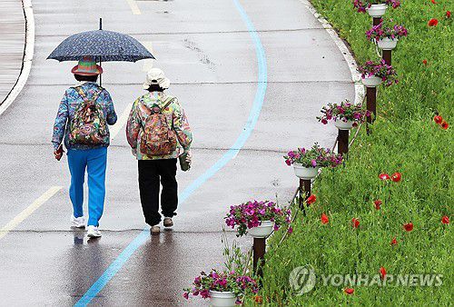 (장성=연합뉴스) 조남수 기자 = 9일 전남 장성 황룡강변에서 시민들이 우산을 쓰고 산책하고 있다. 2025.5.9 iso64@yna.co.kr